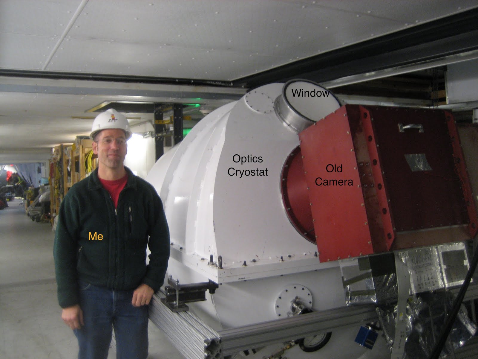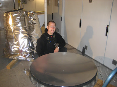 The circular thing in that picture is the vacuum window of the optics cryostat (which keeps the secondary optics very cold, 10 degrees Kelvin, more on that below), which was still mounted up in the cabin at the time.
