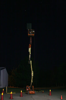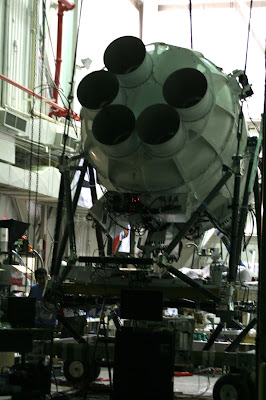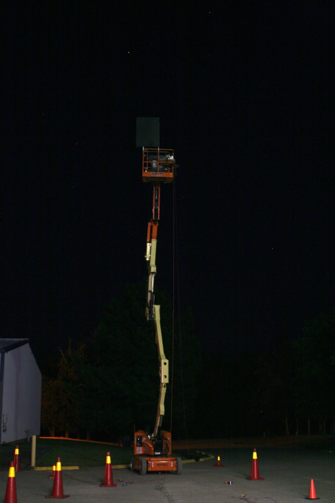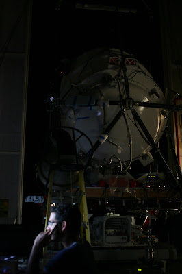 The payload sure looks impressive… here it is, looking out the highbay door at night while mapping telescope response on a “hot source” in the parking lot. We have five of the six telescopes in place – the dark circles are baffles that keep stray light from getting into the telescopes. The whole payload is, in this picture, hanging from a crane, scanning back and forth driven by its onboard systems.