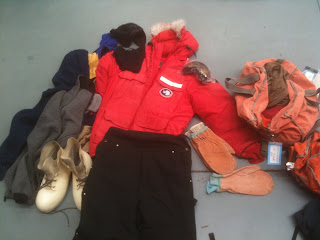 This afternoon I went to the USAP clothing distribution center, where a whole bunch of us were issued our cold weather gear. Here’s a picture of some of my gear laid out on the floor. You’ll notice the big red warm parka, the white “bunny boots” which are very warm, and the black insulated pants. Off to the left is some warm fleece, and to the right are the two orange bags we pack this all in, and some ski goggles that we’re required to carry, but I prefer sunglasses.